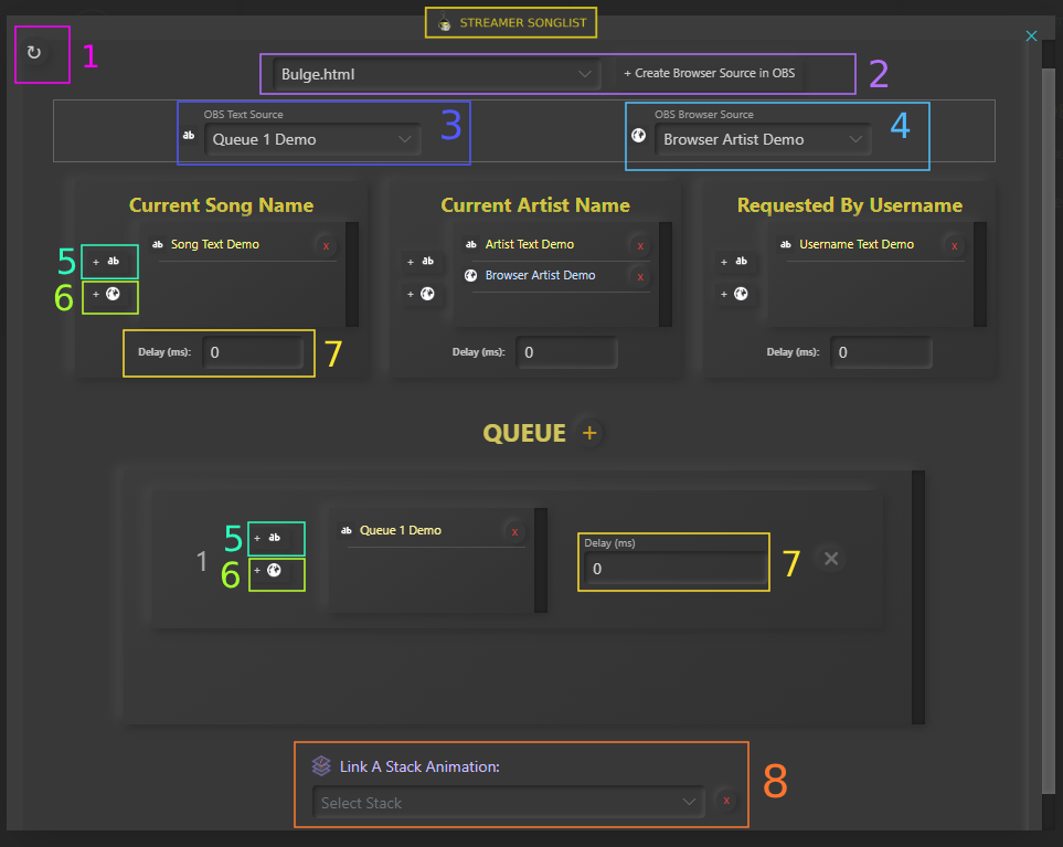 Stream Animate > Extensions > StreamerSonglist > Set OBS Sources