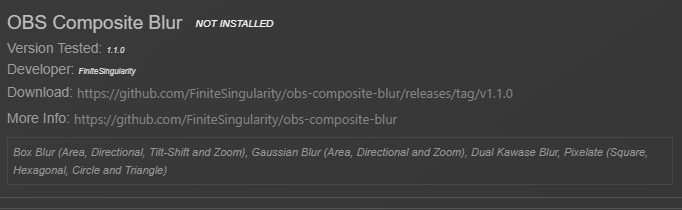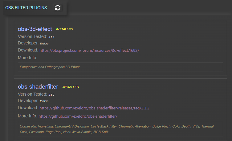 On the Settings page if you scroll down you will find “OBS FILTER PLUGINS”. This shows you what filters have been added, where you can download them, if it’s installed in the current open OBS and whether the version is fully compatible.
