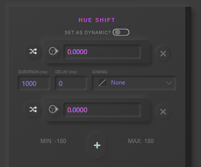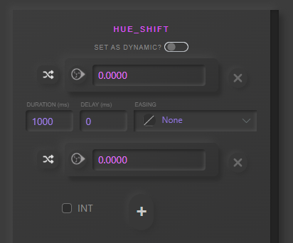 Using Color Correction as an example. Slight name difference Hue Shift vs Hue_Shift. There are no Min/Max restriction on the custom filter (right). INT checkbox for settings that are integers.
