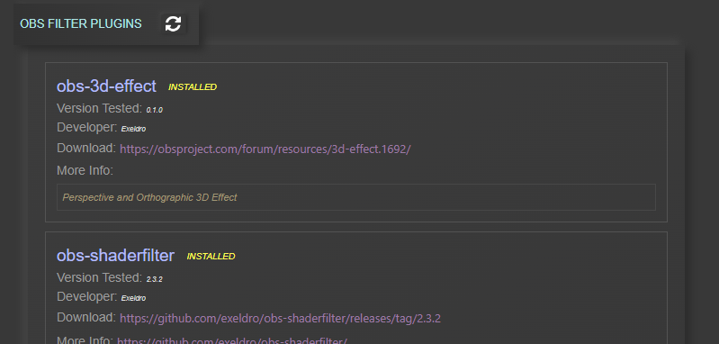 A curated list of popular plugins for OBS that have been manually added to work seamlessly with Stream Animate. It automatically checks whether they are installed in OBS and if the version matches those that are tested. More Info and Download links are supplied.