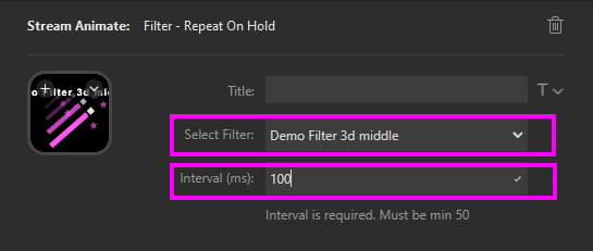 4. Filter Repeat on Hold – Choose a filter animation and set Interval (ms) – The animation will repeat every Interval while the button is held down
